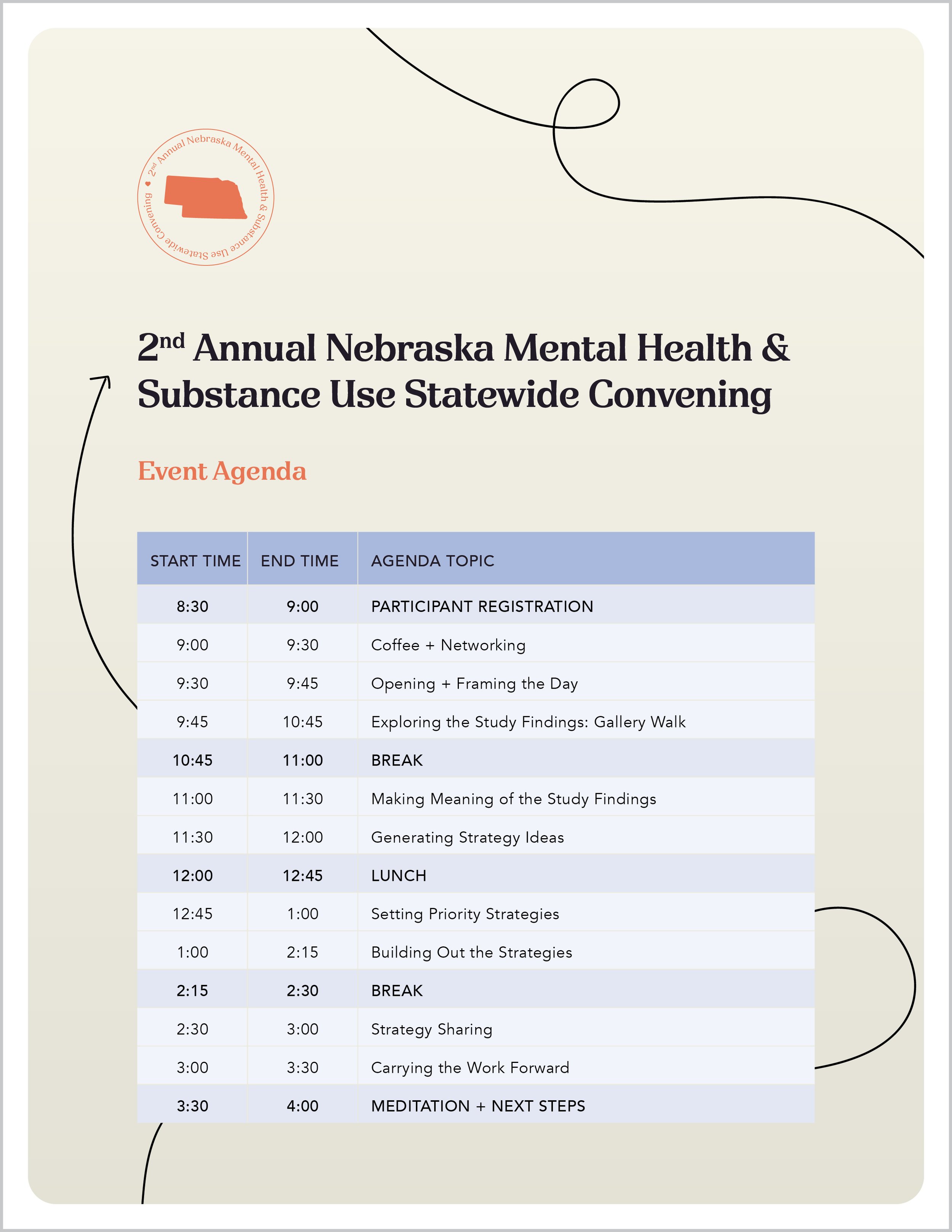 A detailed schedule for the 2nd Annual Nebraska Mental Health & Substance Use Statewide Convening, outlining sessions, discussions, and collaborative activities.